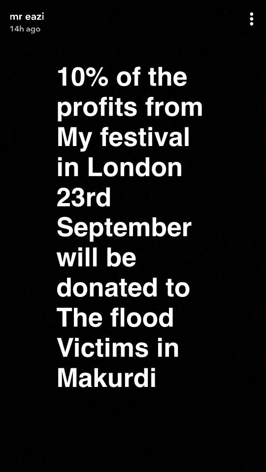 Nigerian singer, Oluwatosin Oluwole Ajibade better known by his stage name, Mr. Eazi has taken to his Snapchat account to declare that 10% of the profit from his London festival this month will be donated to the flood victims in Makurdi.