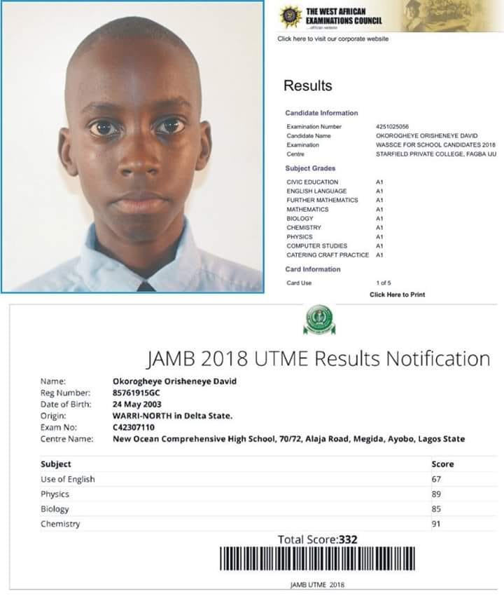 David okorogheye, the delta state boy who floored his jamb and waec with 332 and 9A1’s respectively has been denied admission into the university of lagos to study medicine, on the ground of his young age.