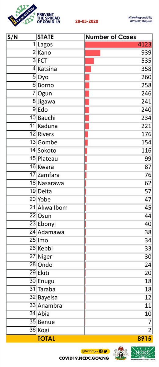 In a new update on their Twitter page, the NCDC reports that there’s new cases in Lagos, FCT, Akwa Ibom, Oyo, Kaduna, Delta, Rivers, Ogun. Ebonyi, Kano, Plateau, Gombe, Kebbi, Kwara, Bauchi and Borno.