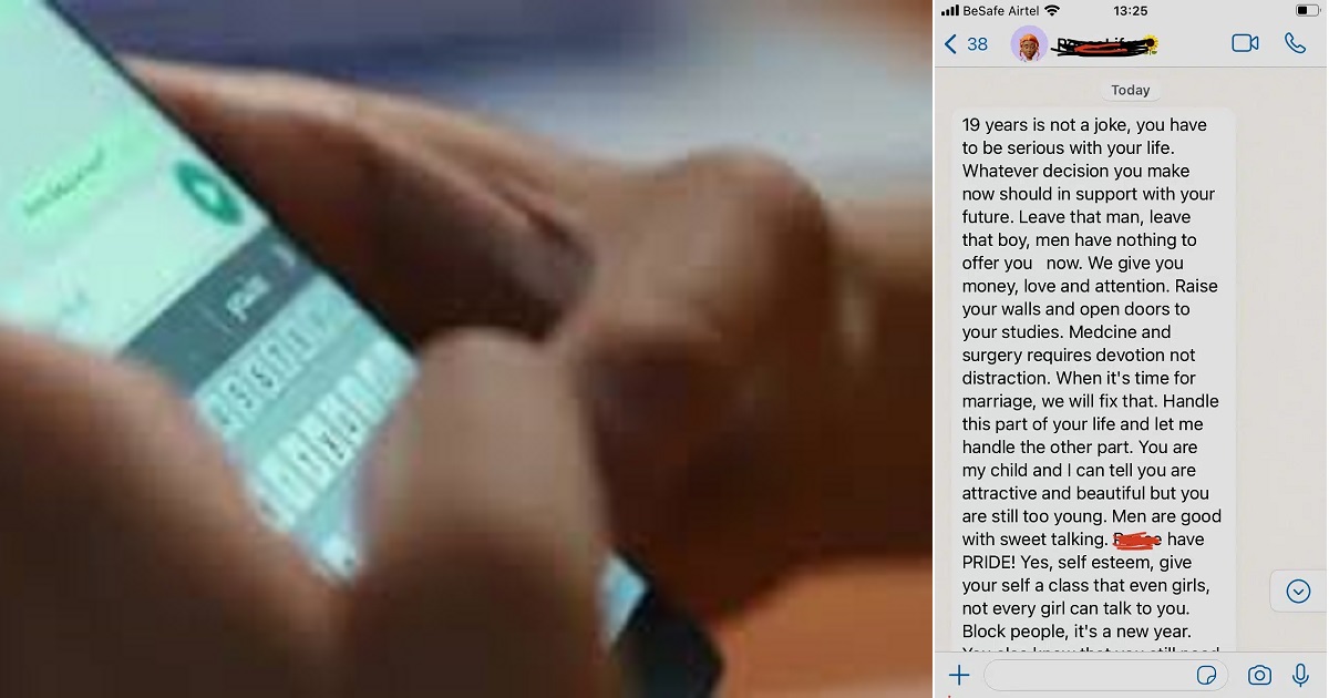 “19 years is not a joke, you have to be serious with your life. Whatever decision you make now should in support with your future. Leave that man, leave that boy, men have nothing to offer you now. We give you money, love and attention. Raise your walls and open doors to your studies. Medcine and surgery requires devotion not distraction. When it’s time for marriage, we will fix that. Handle this part of your life and let me handle the other part. You are my child and I can tell you are attractive and beautiful but you are still too young. Men are good with sweet talking.