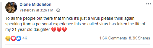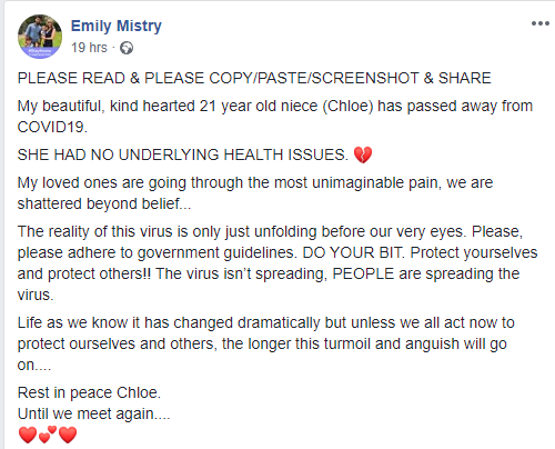 My beautiful, kind hearted 21 year old niece (Chloe) has passed away from COVID19.