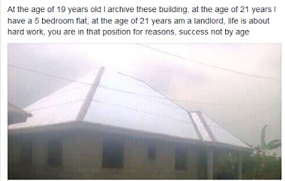 “At the age of 19 years old I archive these building, at the age of 21 years I have a 5 bedroom flat, at the age of 21 years am a landlord, life is about hard work, you are in that position for reasons. success not by age”