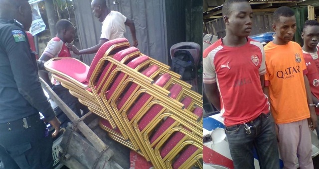 According to the RRS ; ‘he was caught by our men at about 5:48am selling off 9 chairs belonging to the event centre to these two men. They have been handed over to the Sabo Police Station for further investigation’.