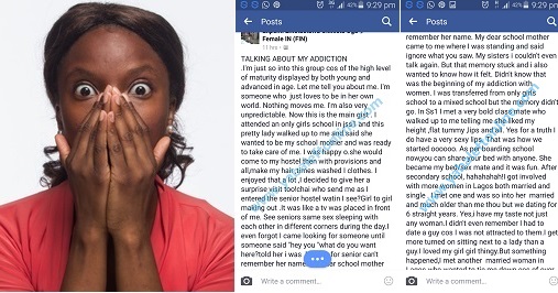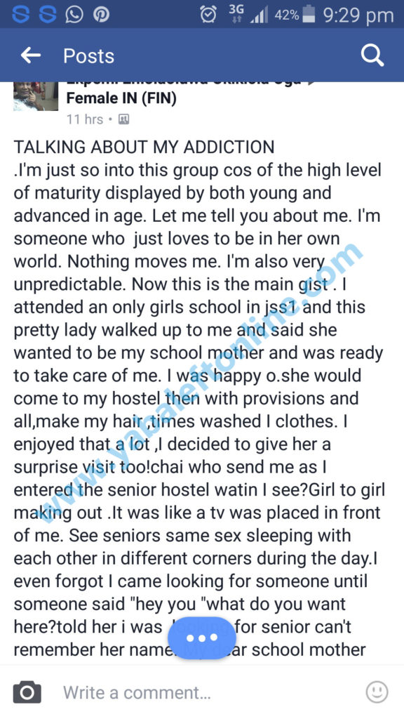 Another member of the group has opened up to us, and shared with us an exclusive screenshot of a lady who narrated how she was Introduced into lesbianism in Junior Secondary school by her School Mother.