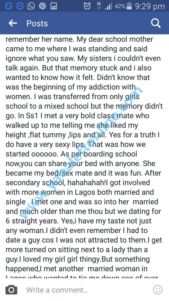She became my bed/sex mate and it was fun. After secondary school, hahahahah!I got involved with more women in Lagos both married and single. I met one and was so into her married and much older than me thou but we dating for 6 straight years. Yes,I have my taste not just any woman.I didn’t even remember I had to date a guy cos I was not attracted to them.I get more turned on sitting next to a lady than a guy. I loved my girl girl thingy.But something happened,I met another married woman in Lagos who wanted to tire me down cos of over loving and me wasn’t ready for suck. She even wanted me to come live with her cos her hubby travelled and all. But I declined. I’m 27 became very matured from a tender age ,cos I mingle with ladies much older than me .I moved to Abuja from Lagos two years back cos I needed a break but they never stopped calling.