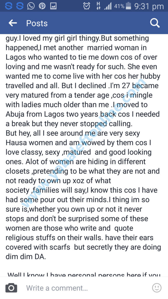 But hey, all I see around me are very sexy Hausa women and am wowed by them cos I love classy, sexy ,matured and good looking ones. Alot of women are hiding in different closets ,pretending to be what they are not and not ready to own up xoz of what society ,families will say,I know this cos I have had some pour out their minds.I thing im so sure is,whether you own up or not it never stops and don’t be surprised some of these women are those who write and quote religious stuffs on their walls. have their ears covered with scarfs but secretly they are doing dim dim DA.