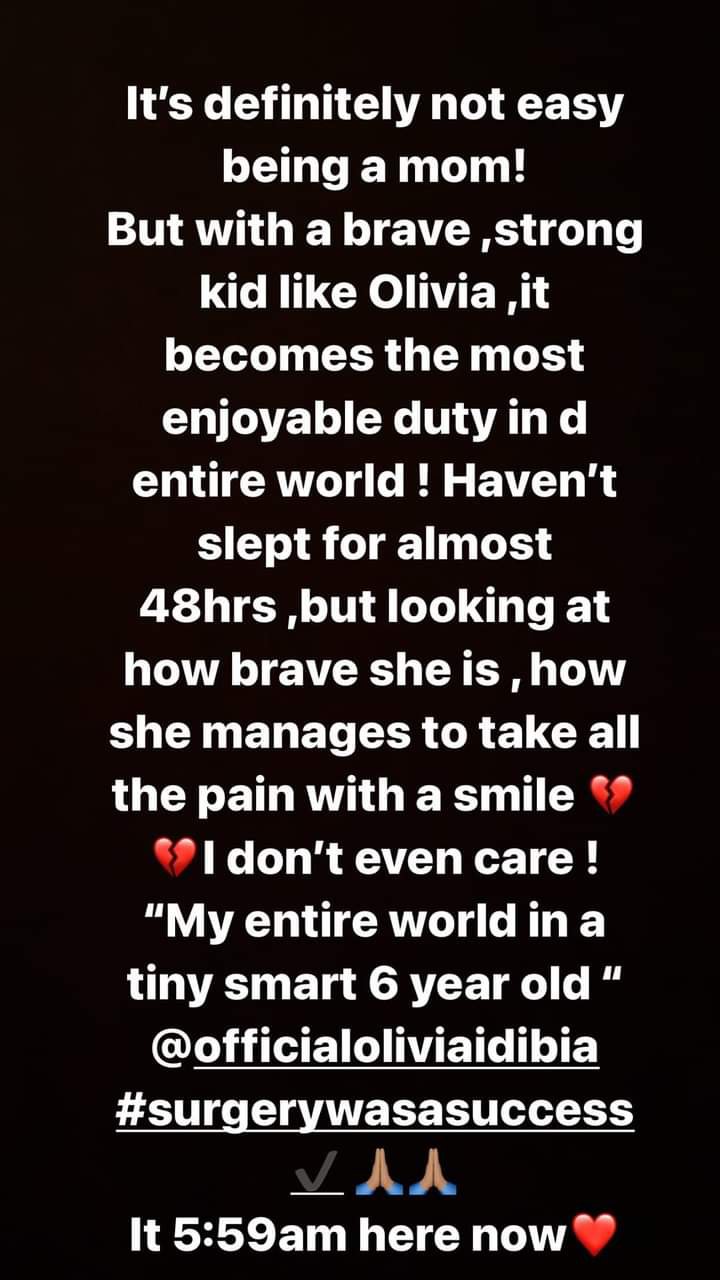 Annie shared that she was unable to sleep for almost 48 hours as she watched her daughter undergo surgery – she however said she was consoled over the fact that her daughter is strong and brave.