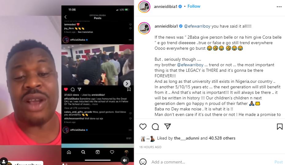 Nigerian actress, Annie Idibia has reacted after her husband, 2face Idibia’s multi-million naira donation to Obafemi Awolowo University, OAU, didn’t get much buzz online.