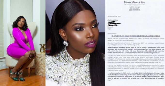 In the lawsuit notice that was served to the actress on November 10, Pero’s lawyers referenced Annie’s Instagram outburst and the audio tape which went viral weeks back where she alleged that her husband, 2Face “packed his bags and came to America to see her (Pero) and his other kids“.