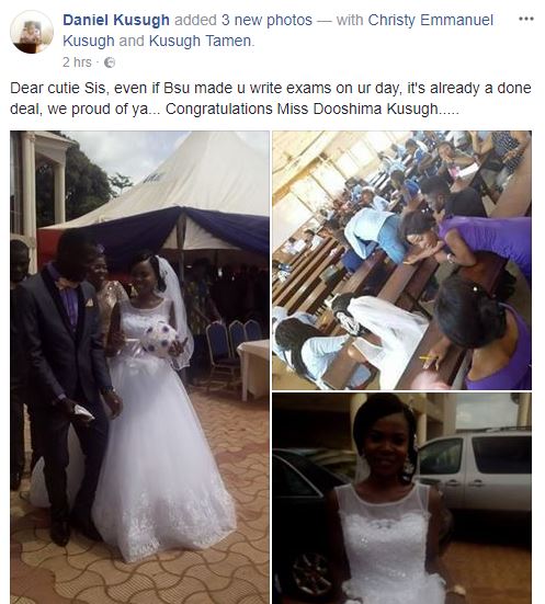 A lady, a student of Benue State University, Level 300, found herself at that cross road and her response to it is quite awing for every one . The lady, Identified as, Dooshima Kusugh unfortunately had her exam on her wedding day and she who presumably has a flair for her education, won’t let her ceremony hinder it.