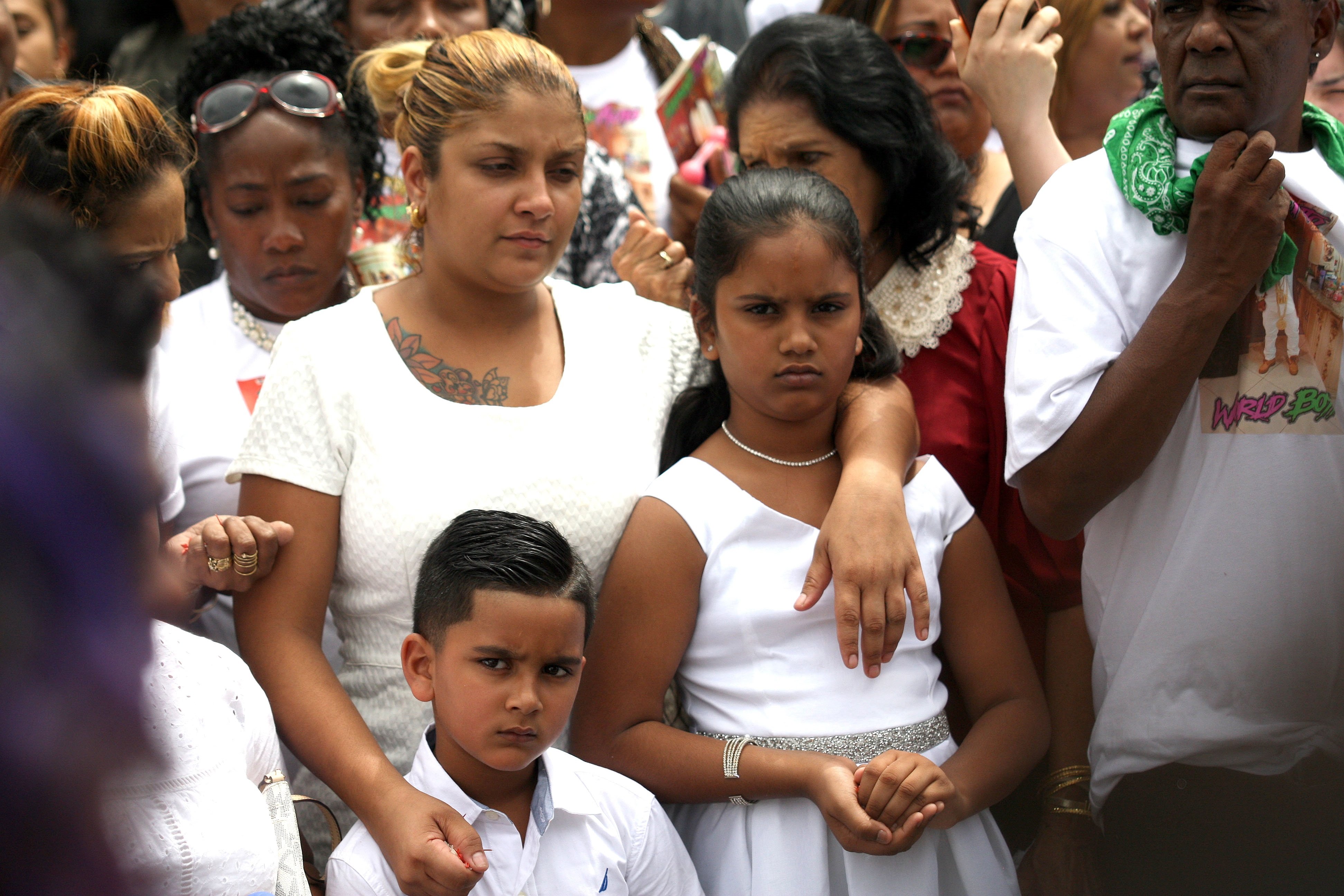 Rachael Sukhdeo, wife of slain Chaguanas businesman , Sheron Sukhdeo who was gunned down while visiting his inlaws at Charlieville. his son Sheron Scott Sukhdeo and daughter Sherona at their fathers funeral which took place at his Xavier street Chaguanas home.