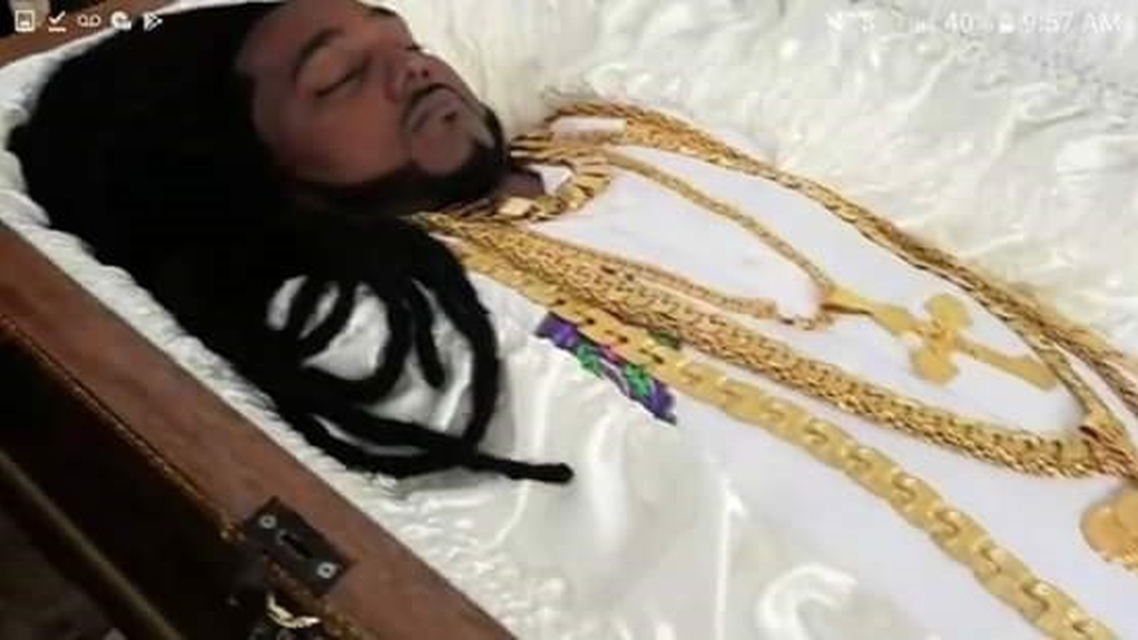 He was dressed in white along with his famous gold jewellery adorning his fingers, hands and neck, he was laid in a $50,000 casket which had words like ‘Sheron’s Auto’ and ‘World Boss’ inscribed in it.