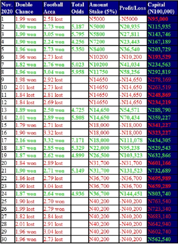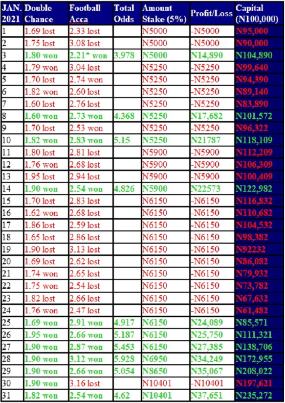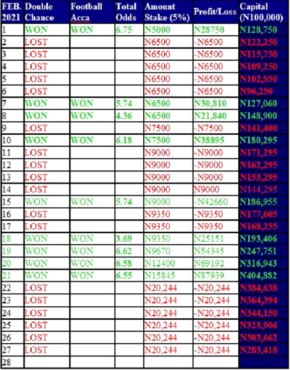 It will wow you to know it was 100k he turned to 8.37million naira in 4 months. This was a journey from Nov. 2020 to February 2021. The strategy is to stake 5% of capital daily and as winnings comes and capital increases, recalculate capital and new 5% daily stake. You can see the drift in the tables of results as achieved in the last 4 months in discuss.