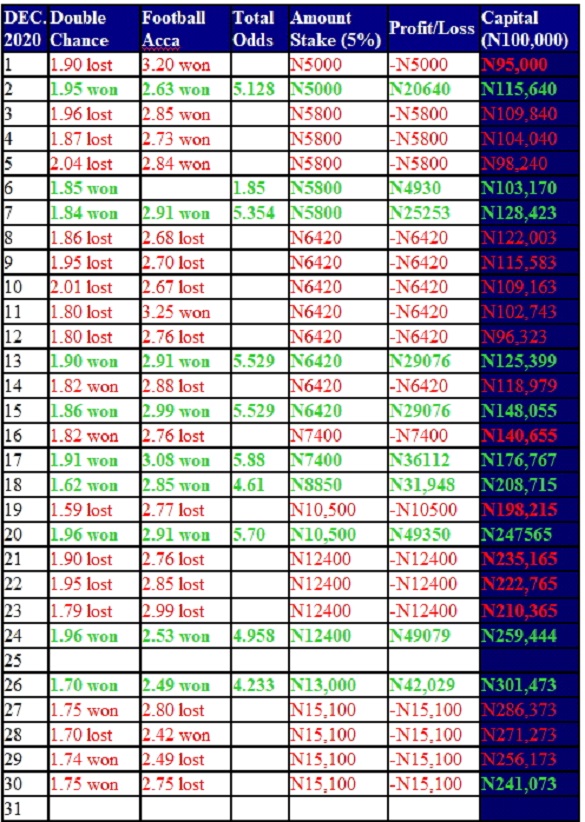 That’s the break down above. And the calculation is simple. Nov 2020 turned 100k to N562,000. If all amount was used in December and with 241% return, it will turn to N1,354,000.