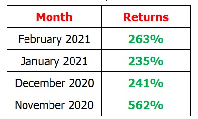 January 2021, if N1,354,000 was used as the capital and a 235% return for that month, it means return would be N3,182,000. If all were used in February and at a 263% return, it would turn to N8,370,000