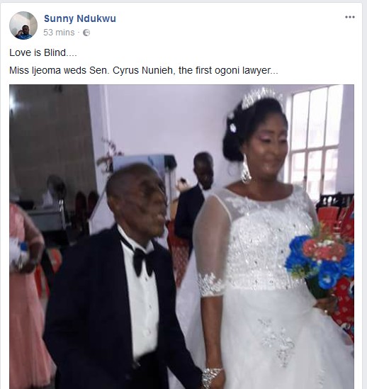 According to multiple online reports, including a Facebook post by Kay Ini SamNgbor, 93-year-old Sen. Cyrus Nunieh, a second republic lawmaker and President of Bori State Movement, got married in style to his lovely heartthrob, Miss Ijeoma in Rivers state earlier today.