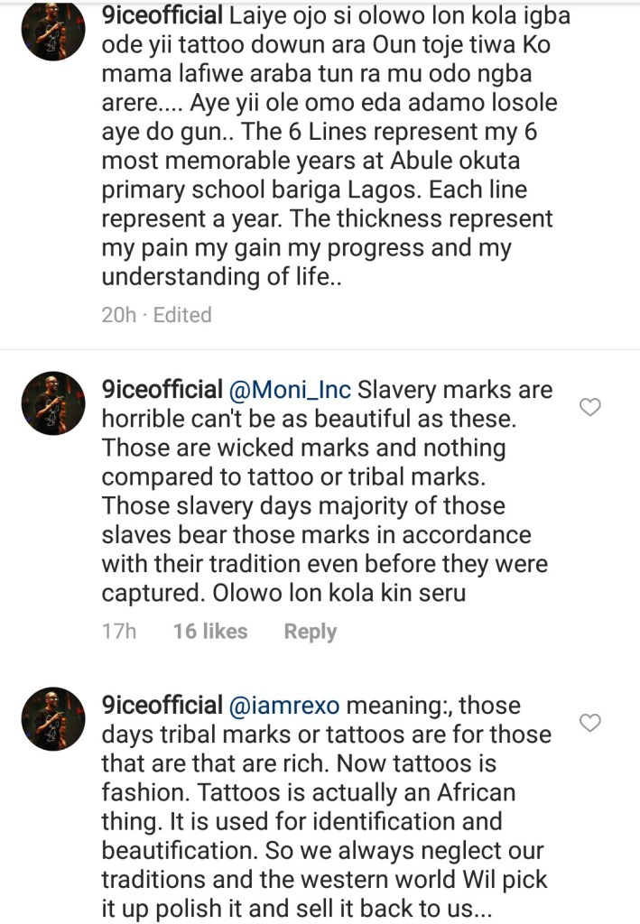 However, 9ice was quick to enlighten his fans that the art of tattoo is not a trend but a tradition and culture belonging to his great grandfathers and as well cautioned his detractors to put sense into their comments.