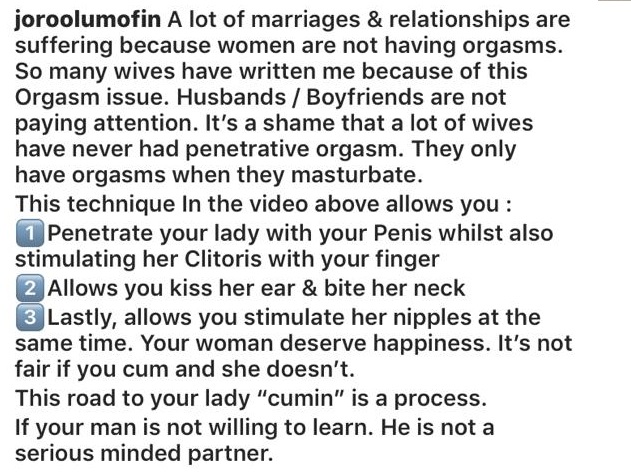 Taking to his page, Joro stated that many marriages today are suffering because the women in it are not getting orgasms.