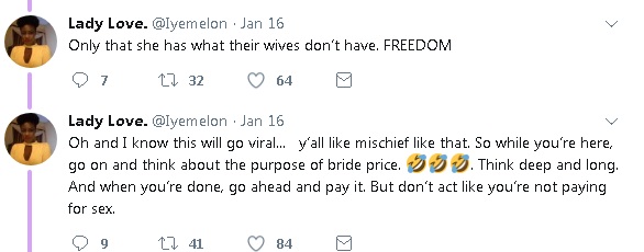 So while you’re here, go on and think about the purpose of bride price. ???. Think deep and long. And when you’re done, go ahead and pay it. But don’t act like you’re not paying for sex.