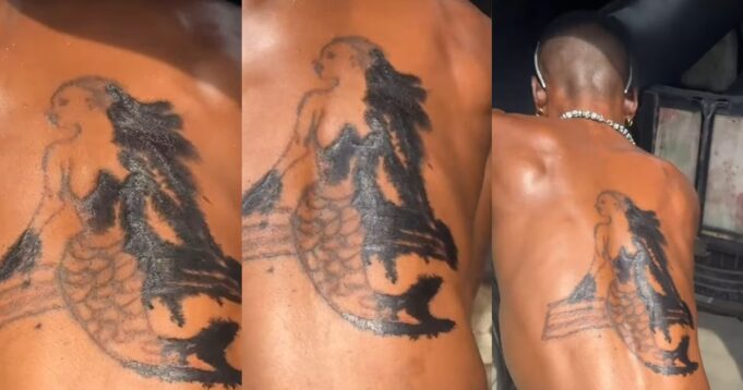 A video posted by @omolile_424 recorded a mermaid tattoo on the man’s back as he cleans his vehicle. The tattoo is shown shining on the man’s back due to the sunlight.