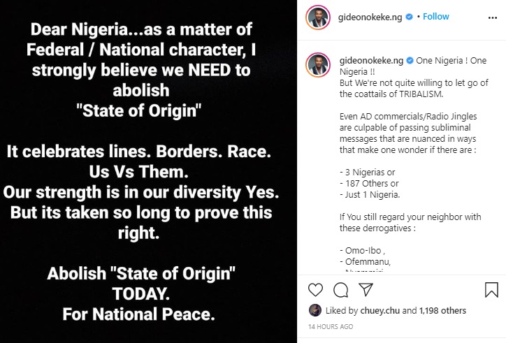 According to the actor, abolishing “state of origin” will bring national peace because the term celebrates “Lines, Borders, Race and all”. He says our strength is in our diversity and as such, the term should be void.