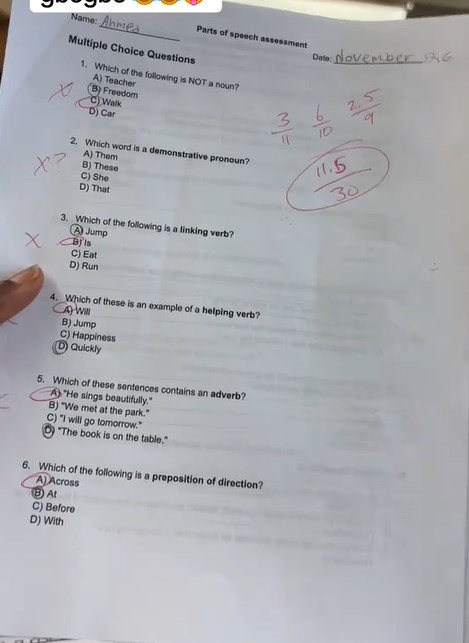 The woman can be heard in the background expressing unhappiness with herself after receiving a score of 20.5/30 on her Parts of Speech assessment.