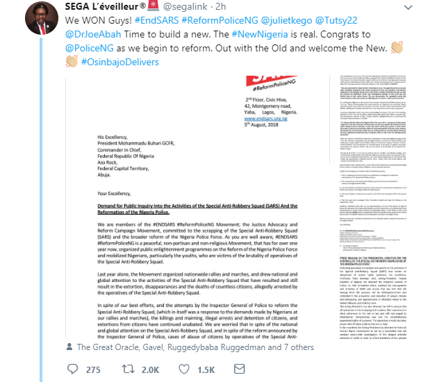 “We WON Guys! #EndSARS #ReformPoliceNG @julietkego @Tutsy22@DrJoeAbahTime to build a new. The #NewNigeria is real. Congrats to @PoliceNG as we begin to reform. Out with the Old and welcome the New. #OsinbajoDelivers