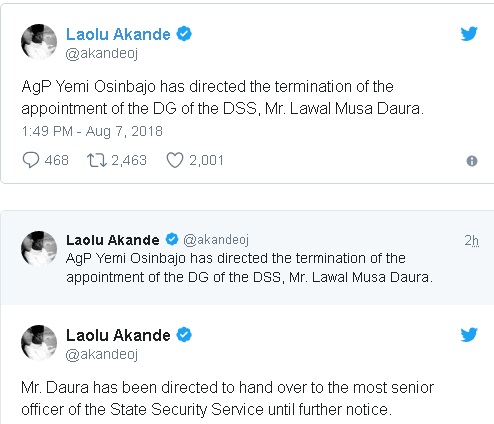 AgP Yemi Osinbajo has directed the termination of the appointment of the DG of the DSS, Mr. Lawal Musa Daura.