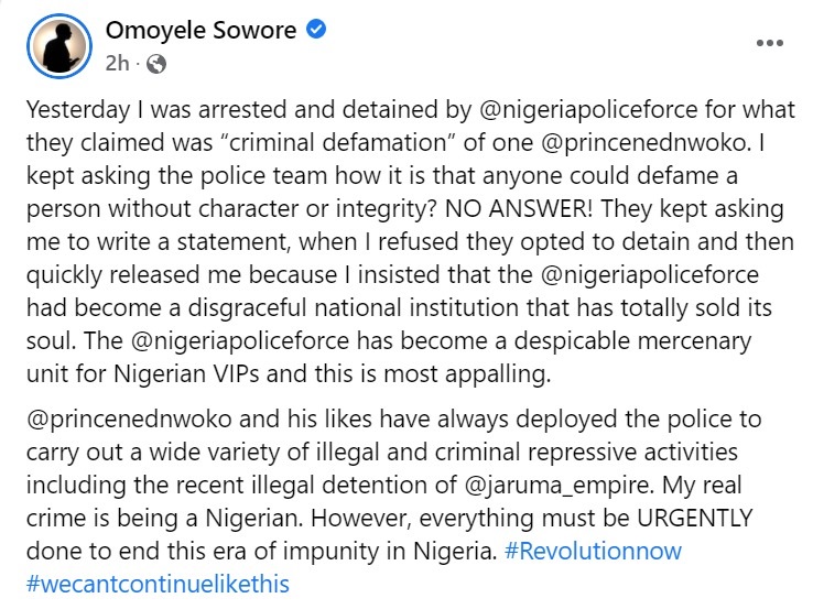 “Yesterday I was arrested and detained by @nigeriapoliceforce for what they claimed was “criminal defamation” of one @princenednwoko. I kept asking the police team how it is that anyone could defame a person without character or integrity? NO ANSWER! They kept asking me to write a statement, when I refused they opted to detain and then quickly released me because I insisted that the @nigeriapoliceforce had become a disgraceful national institution that has totally sold its soul. The @nigeriapoliceforce has become a despicable mercenary unit for Nigerian VIPs and this is most appalling.