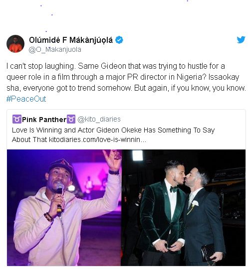 I can’t stop laughing. Same Gideon that was trying to hustle for a queer role in a film through a major PR director in Nigeria? Issaokay sha, everyone got to trend somehow. But again, if you know, you know. #PeaceOut