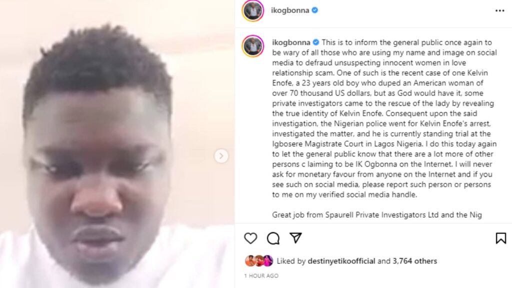“This is to inform the general public once again to be wary of all those who are using my name and image on social media to defraud unsuspecting innocent women in love relationship scam. One of such is the recent case of one Kelvin Enofe, a 23 years old boy who duped an American woman of over 70 thousand US dollars, but as God would have it, some private investigators came to the rescue of the lady by revealing the true identity of Kelvin Enofe. Consequent upon the said investigation, the Nigerian police went for Kelvin Enofe’s arrest, investigated the matter, and he is currently standing trial at the Igbosere Magistrate Court in Lagos Nigeria. I do this today again to let the general public know that there are a lot more of other persons c laiming to be IK Ogbonna on the Internet. I will never ask for monetary favour from anyone on the Internet and if you see such on social media, please report such person or persons to me on my verified social media handle.”