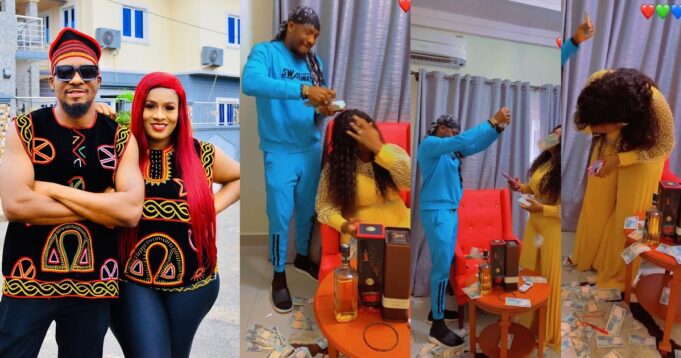 He also shared a video of himself spraying his wife wads of cash in their sitting room and asked his fans and followers to join him in celebrating his special woman.