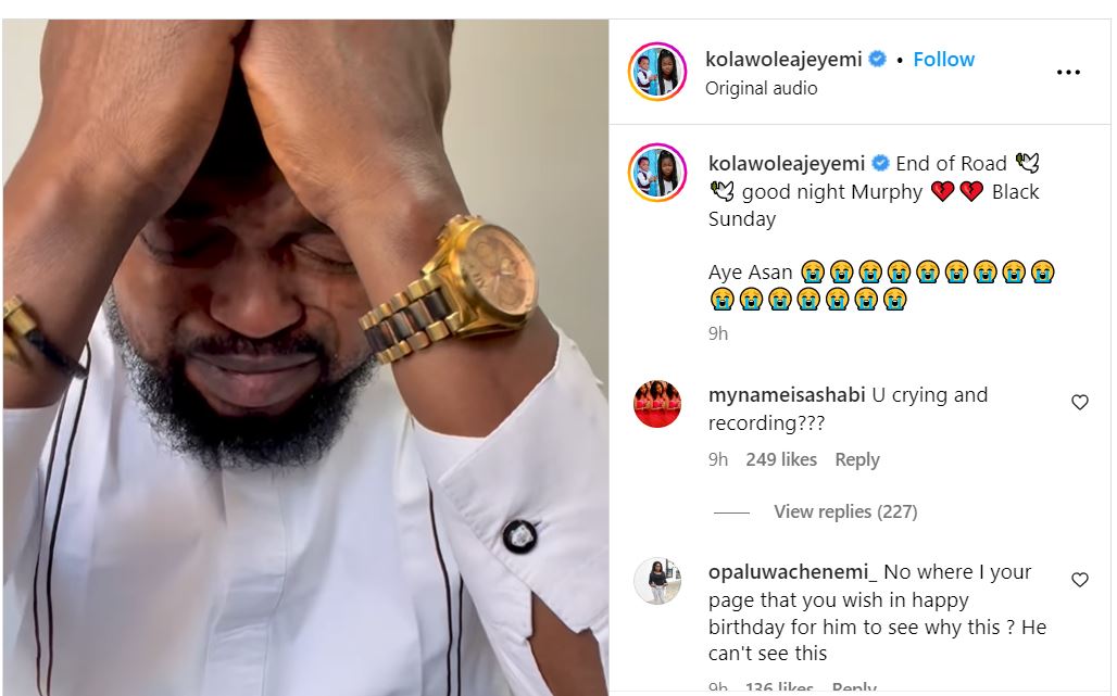 Mourning Murphy’s death, Kolawole Ajeyemi shared a video of himself weeping bitterly as he paid tribute to the late actor.