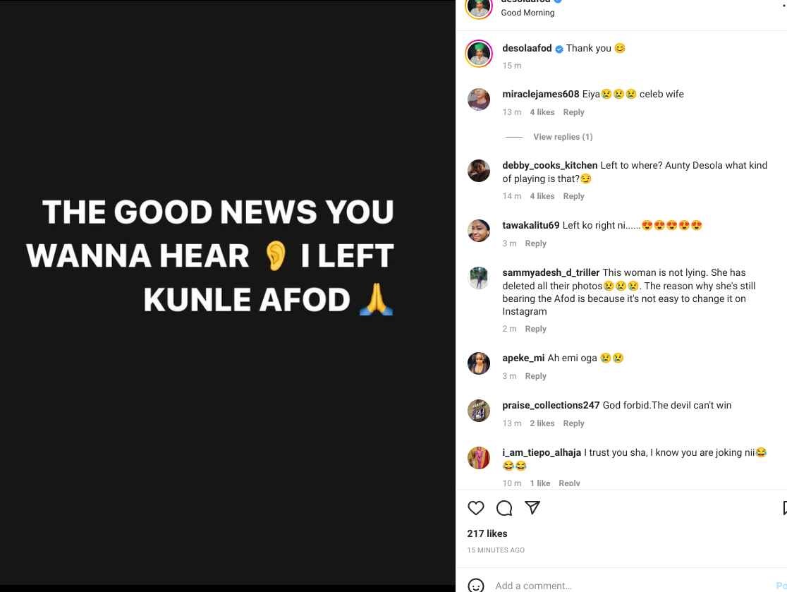 “The good news you wanna hear. I left Kunle Afod.” She wrote.