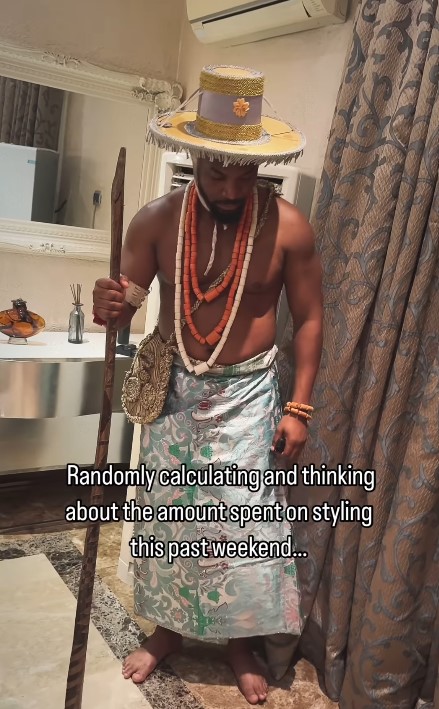 Recounting the amount spent on the events’ styling, Kunle posted on Instagram, looking like a Warri man, shirtless, with a wrapper around his waist and a walking stick, and a beaded necklace around his neck.