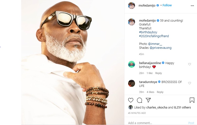 The actor took to his Instagram page to share dapper new photos of himself and wrote; “59 and counting! Grateful! Thankful! #birthdayboy #2020nofallingofhand”