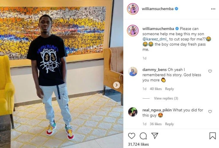 “Please can someone help me beg this my son @kareez_dml_ to cut soap for me?? the boy come day fresh pass me.” He captioned the post.