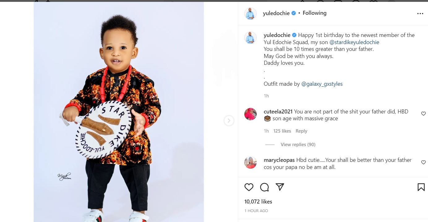 “Happy 1st birthday to the newest member of the Yul Edochie Squad, my son @stardikeyuledochi. You shall be 10 times greater than your father. May God be with you always. Daddy loves you.” He wrote.