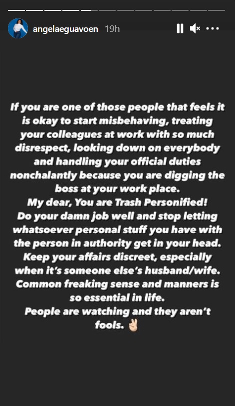 Nollywood actress and fashionista, Angela Eguavoen has called out ladies who start misbehaving and treat their colleagues with disrespect because they are having a sexual affair with their bosses in their workplace.