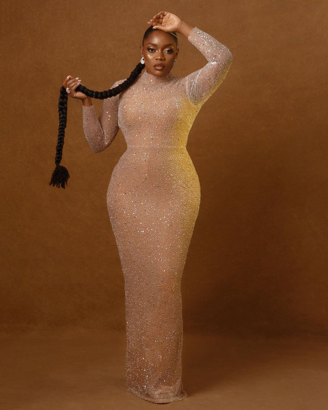 The media personality recreated the American singer Beyonce’s photo, donning a figure-hugging shimmering dress and long braids.