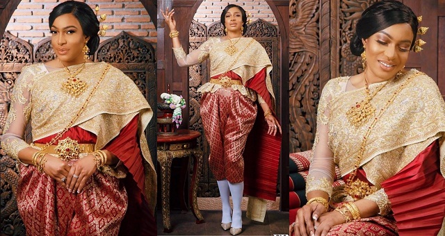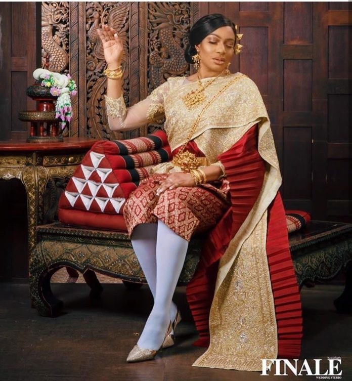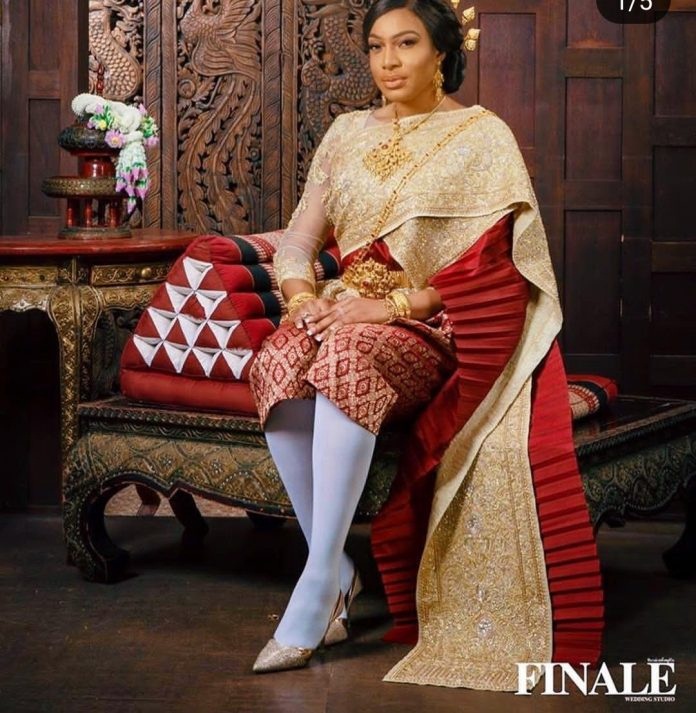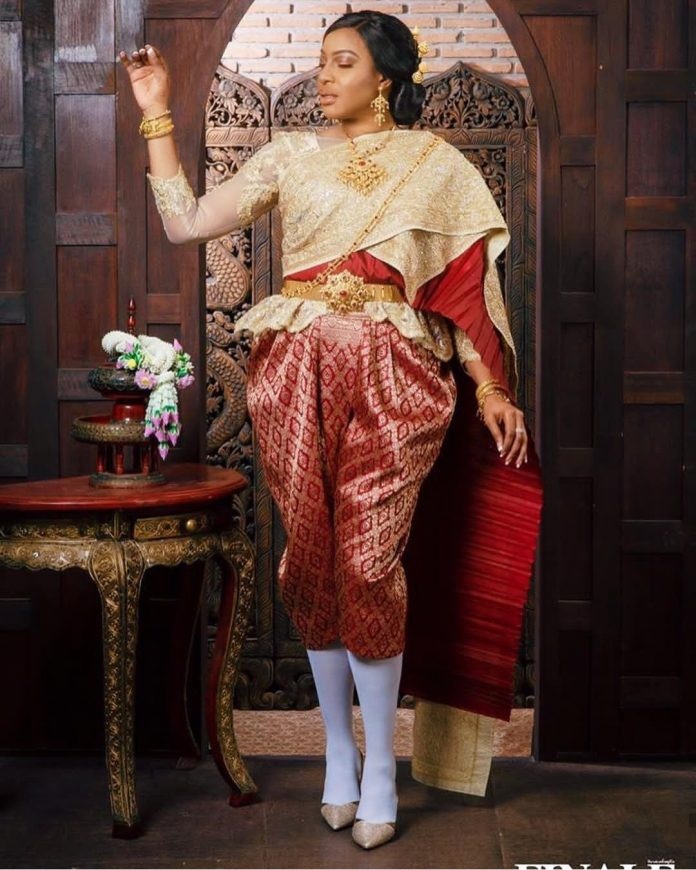 Nollywood Actress and Harvard graduate Chika Ike is presently in Bangkok Thailand attending a wedding. The actress in order to feel like family got a stylist to dress her in the traditional Thai attire and she looks stunning in it.