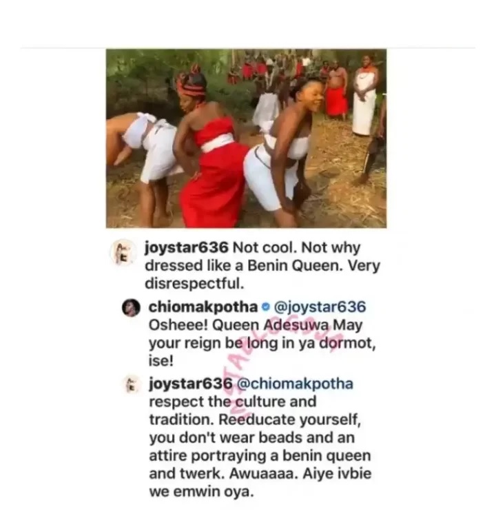Popular Nollywood actress, Chioma Akpota was dragged into an unprecedented exchange by a social media user for disrespecting the Queen of Benin by twerking in a Benin royal costume.