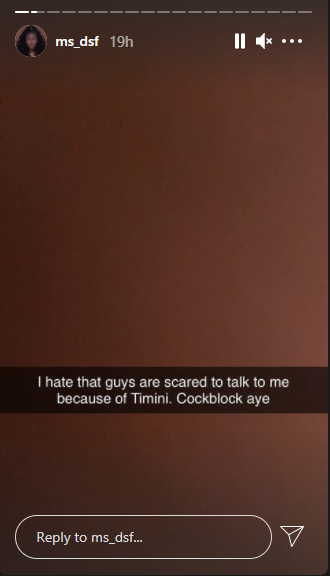 In reaction to the comments, Dorcas took to her Insta-stories to address those accusing her of “sleeping with her best friend, Timini”.