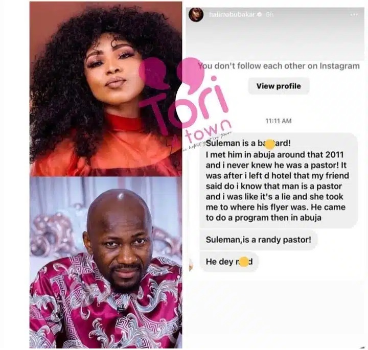 “Suleman is a b*stard. I met him in Abuja around that 2011 and I never knew he was a pastor. It was after I left the hotel that my friend said do I know that man is a pastor and I was like it’s a lie and she took me to where his flyer was. He came to do a program then in Abuja. Suleman is a randy pastor. He dey mad.”