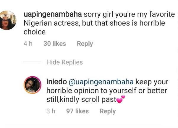 Nollywood actress, Ini Edo has clashed with a fan/troll on Instagram over her Choice of shoes in a recent post she shared on the social media app.