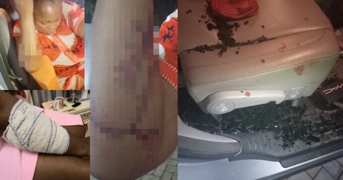 My driver and I were attacked by armed robbers at Arepo where I went to film while in traffic on our way back home yesterday, They broke my windscreens, left my whole body with wounds and skin in pains because of the impact of the shattered glass which was forcefully broken while I was in the car, my arm was cut with cutlass, they took my phones, belongings and ran off! Sadly my driver also took a hit to his head.