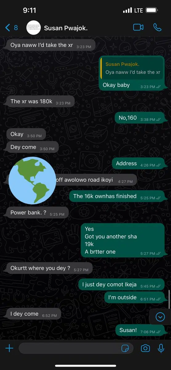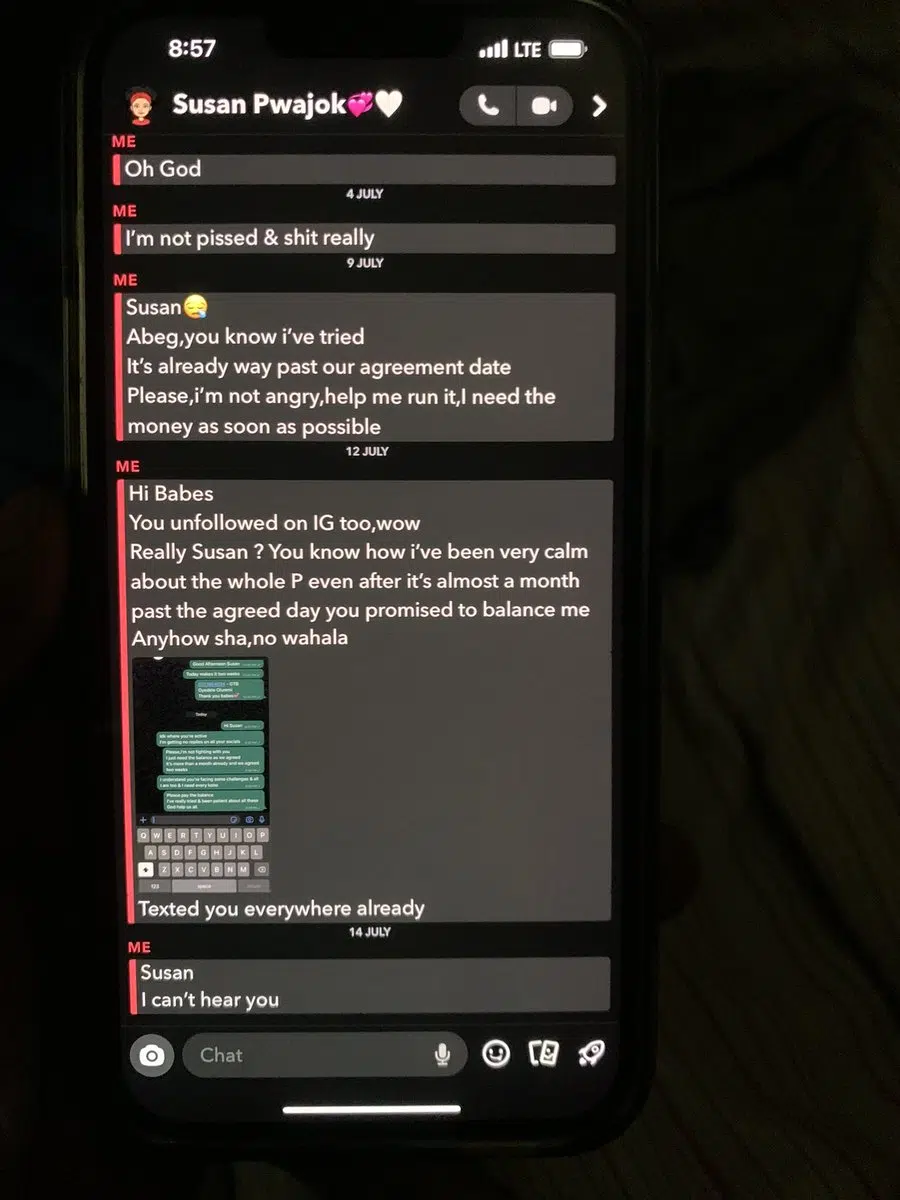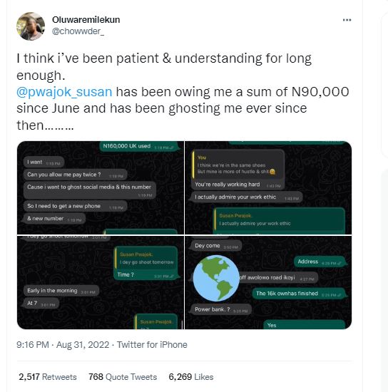 “I think i’ve been patient & understanding for long enough. @pwajok_susan has been owing me a sum of N90,000 since June and has been ghosting me ever since then…… You hit me up telling me how you needed an extra phone urgently wanting to take a break from social media due to mental health reasons and all,stating how you can’t pay me fully instantly and you’d want the payment to be split twice.