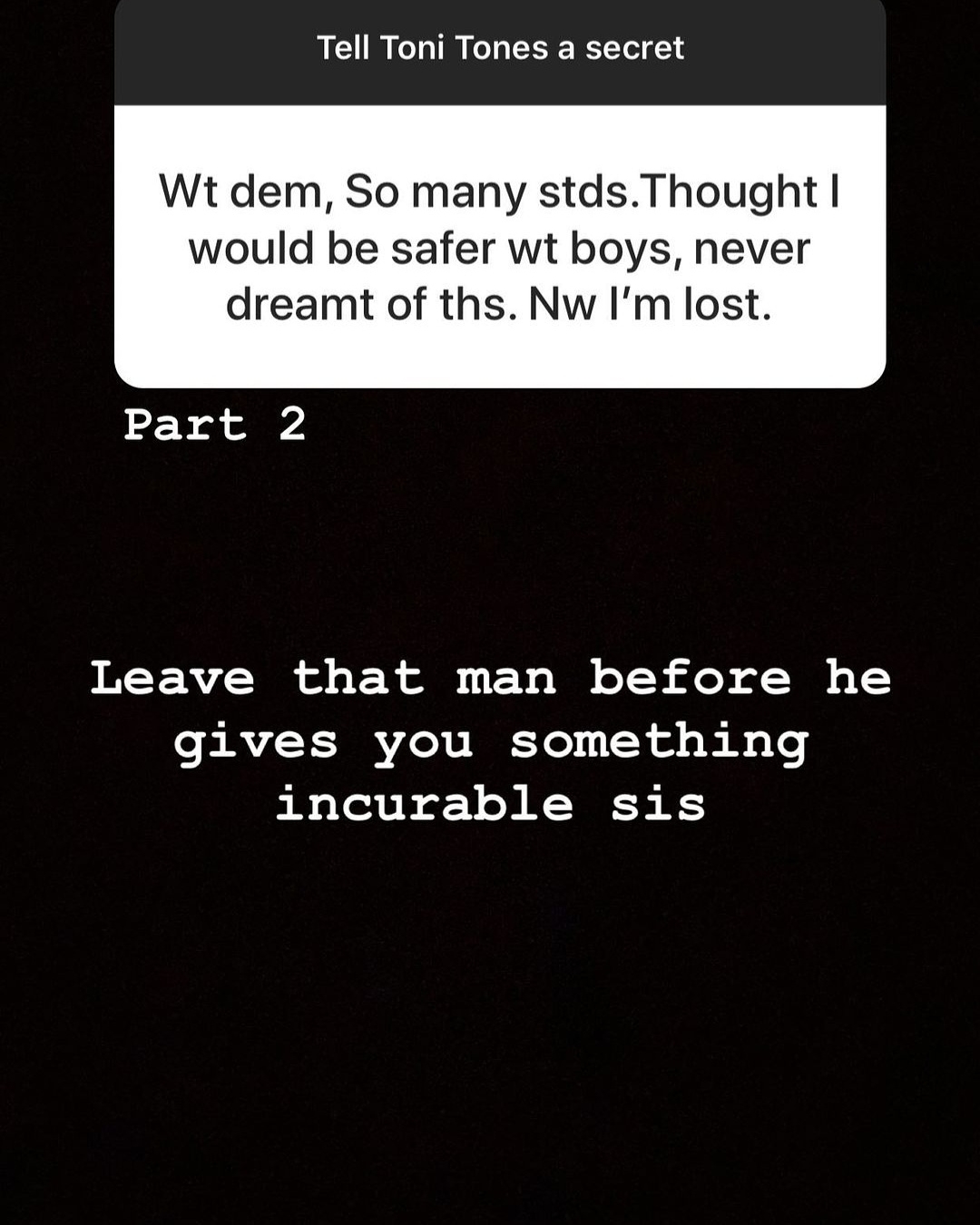 The media personality stated this during a “#TellToniTones” session she held on her Instagram page recently, where she gives her followers the opportunity to share a secret with her.