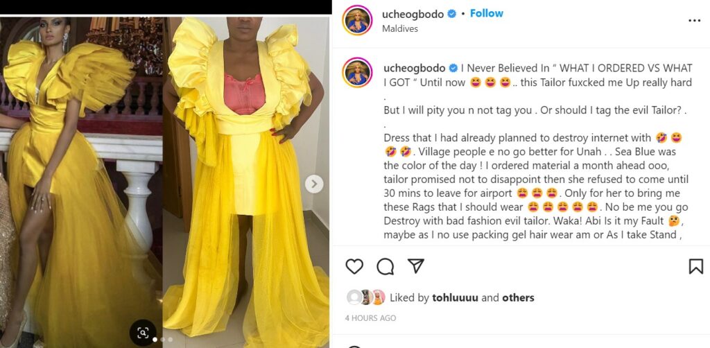 She said the tailor delivered the dresses 30 minutes before her scheduled flight to the Maldives, and she was shocked to see the ‘rags’ she made.
