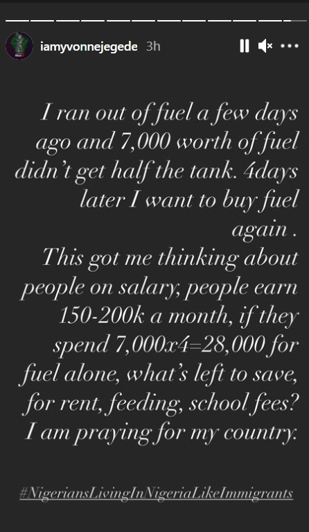 Nollywood Actress, Yvonne Jegede, has taken to her social media page to bitterly lament, after the fuel she bought got exhausted in just a few days.